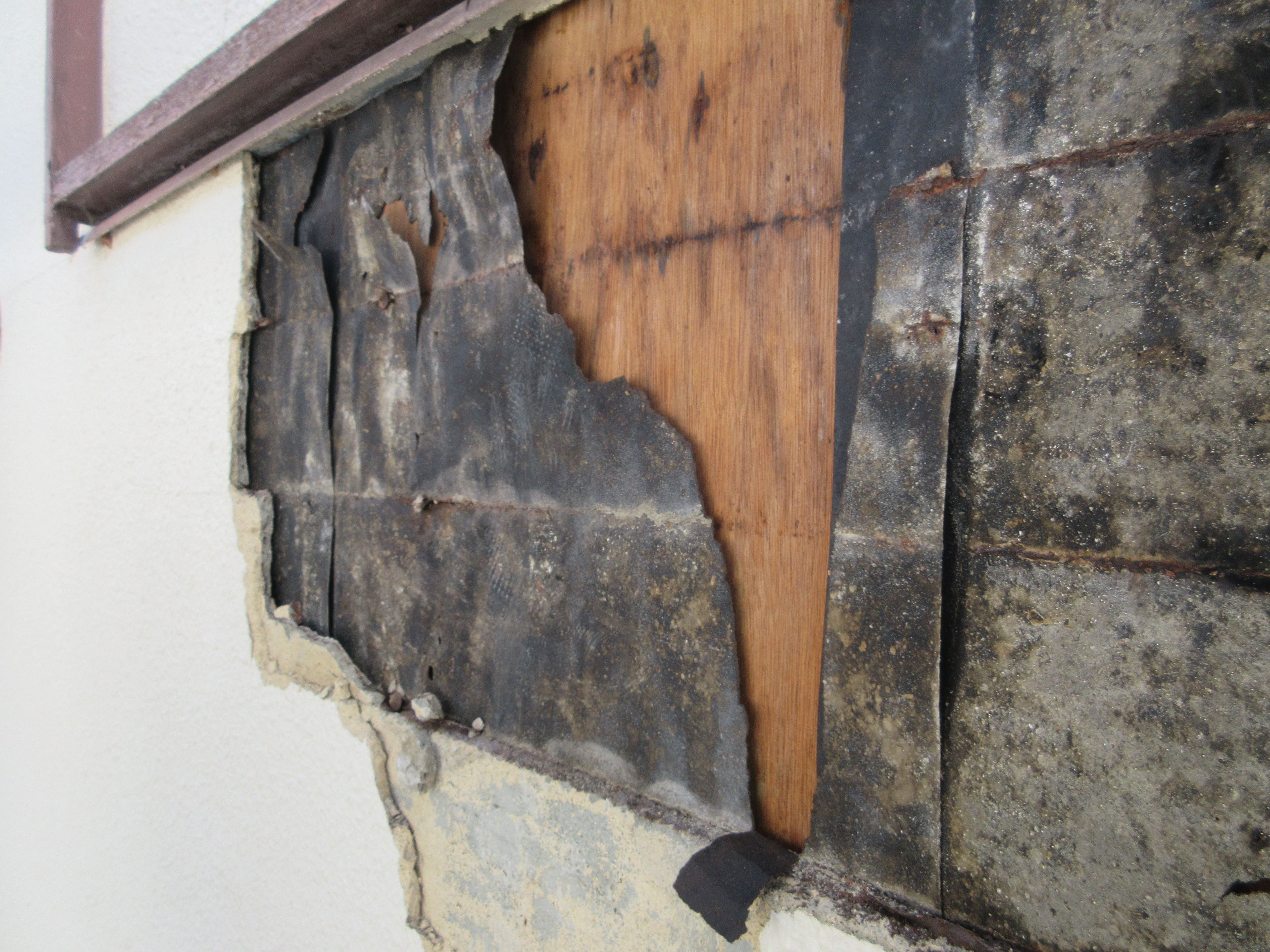 外壁をめくって確認すると下地のラス網が錆びていて下地にくっついていない状態でした。