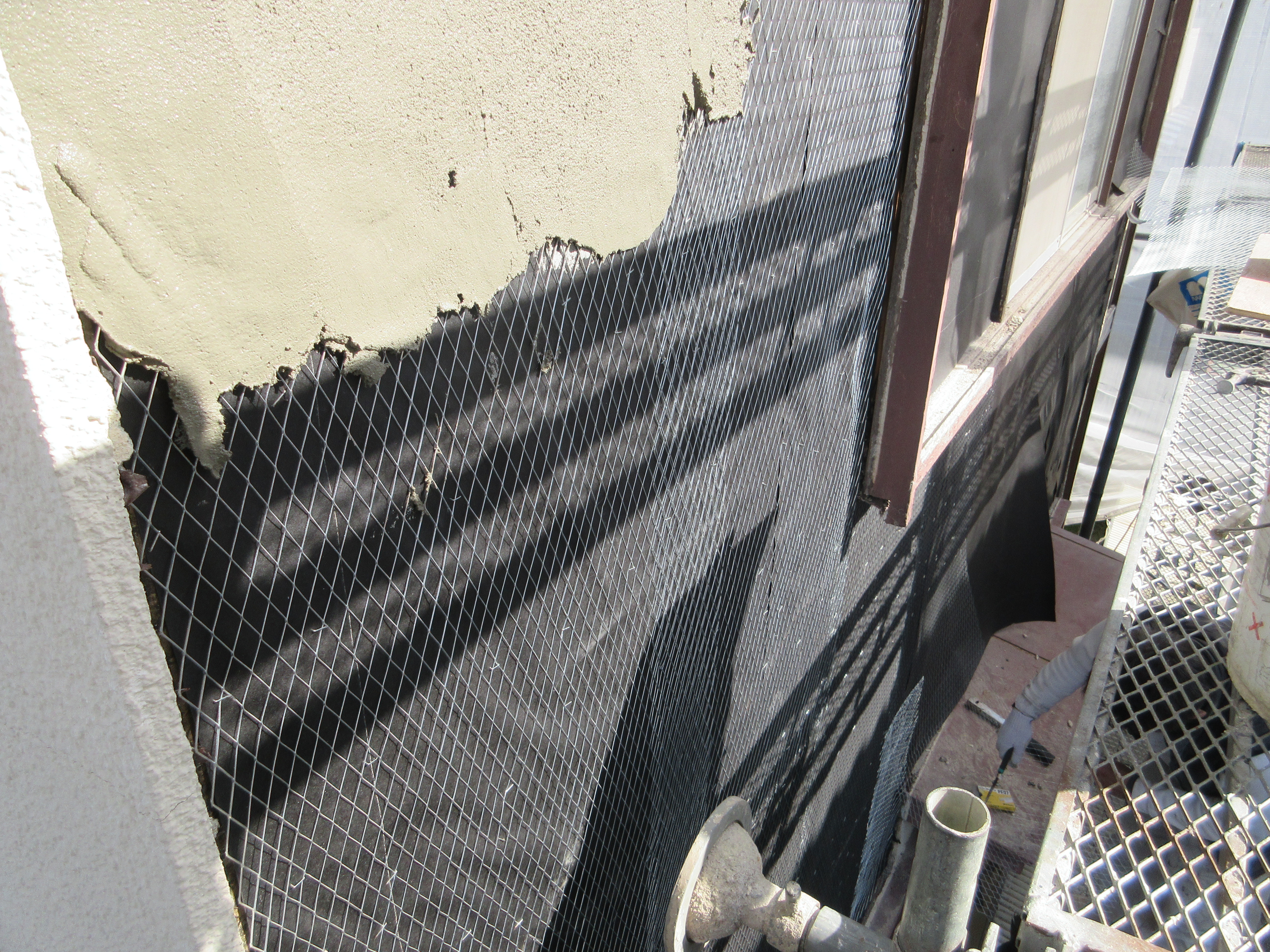 モルタルの補修方法は、古いモルタルとラス網を全てメクリ、