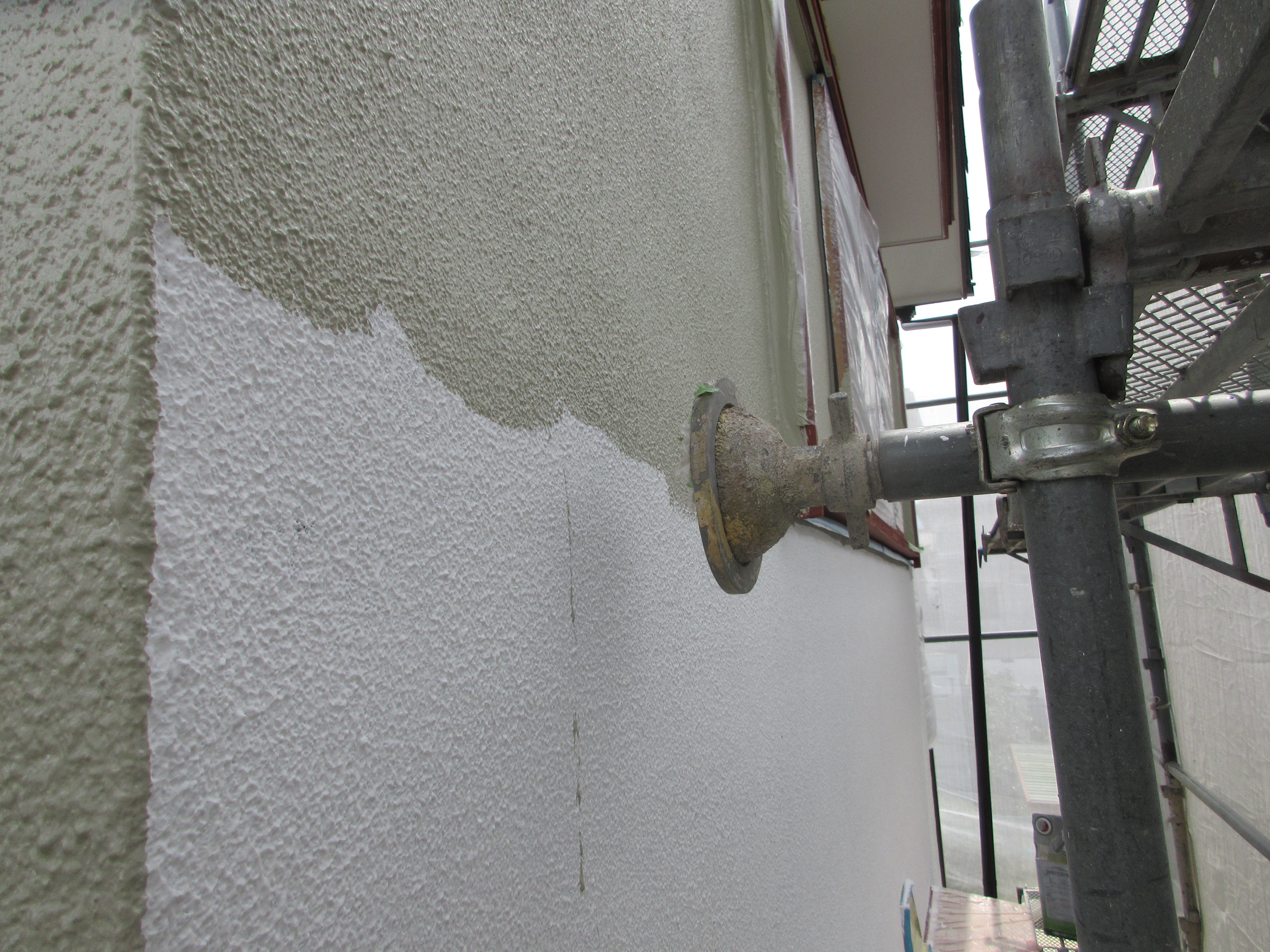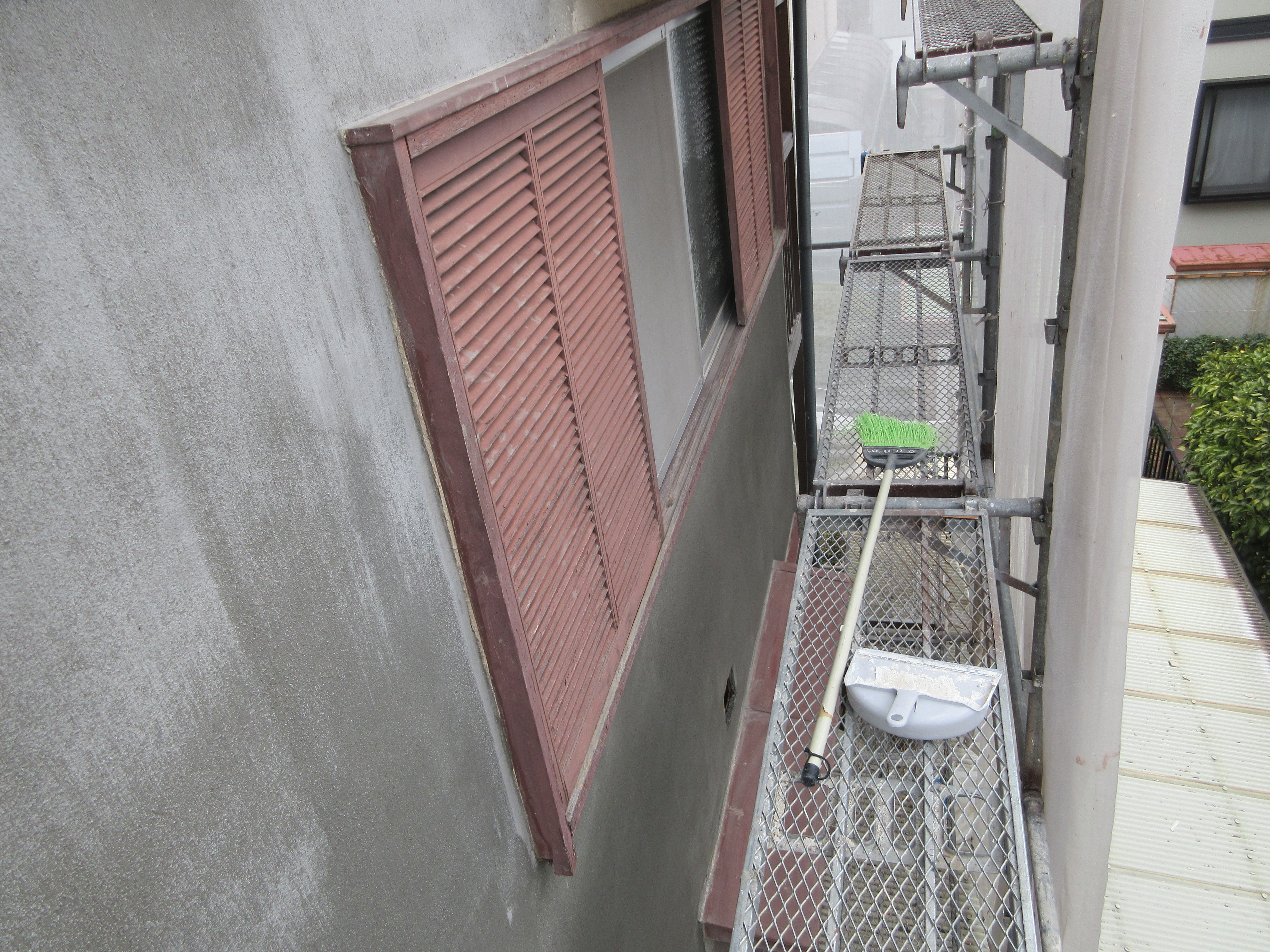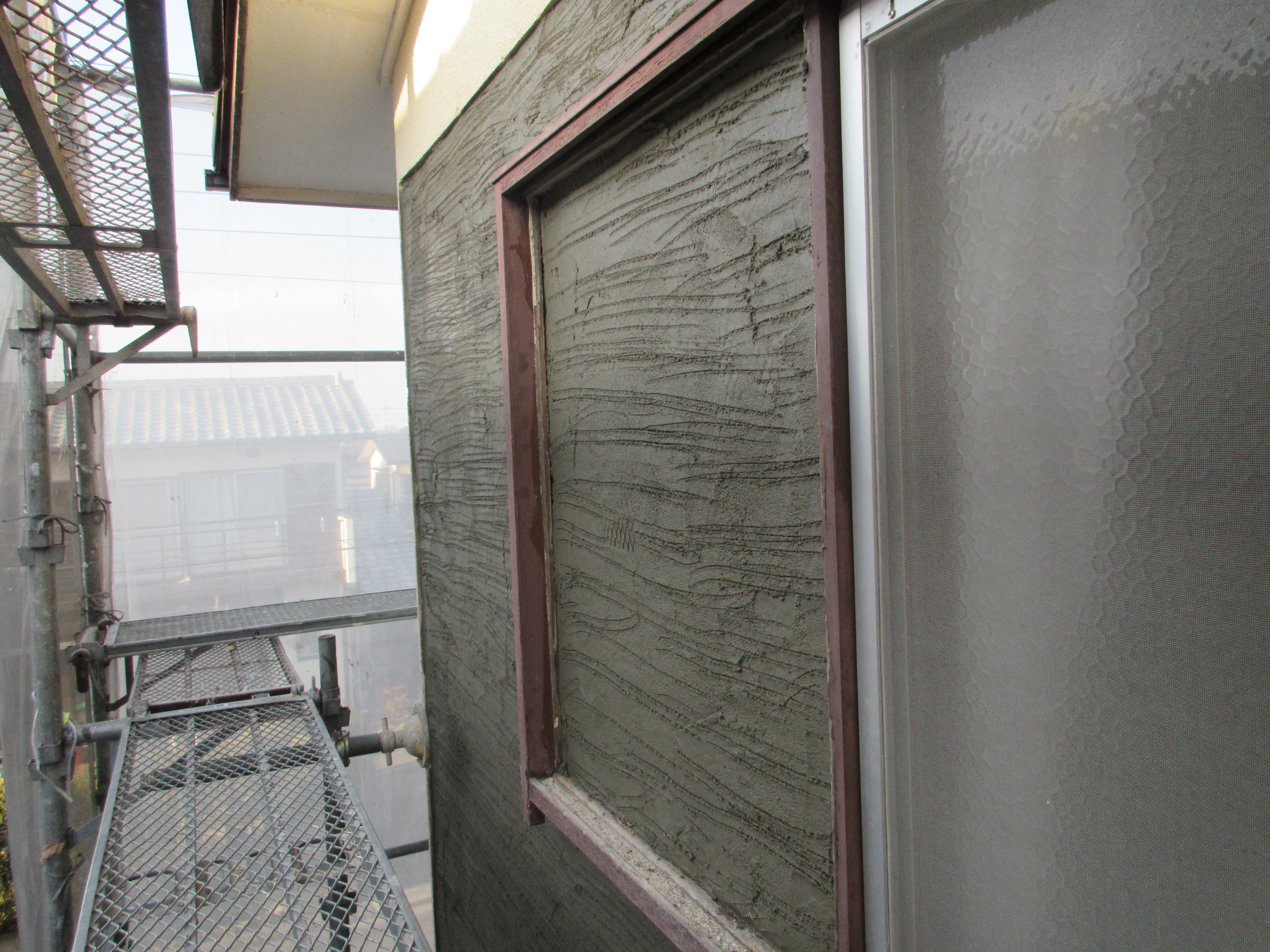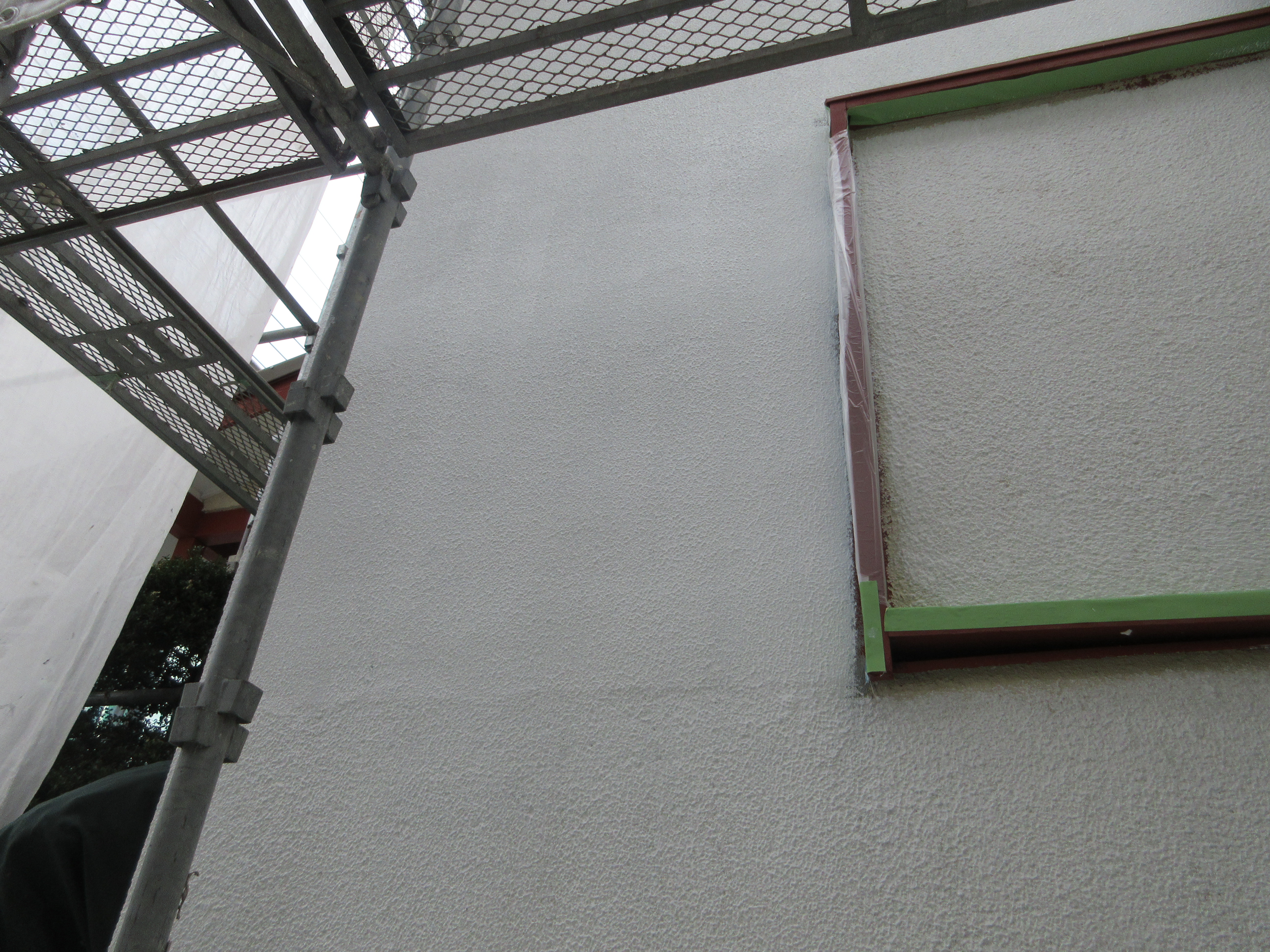 モルタル(外壁下地材)をしっかり乾かして外壁塗装工を施工しました。
