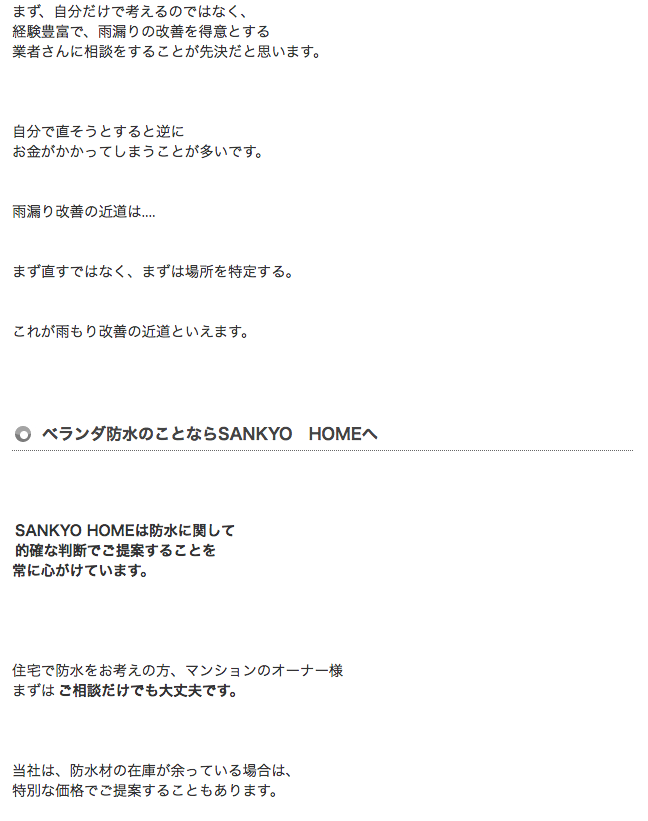 - SANKYO HOMEはベランダの雨漏りを的確に判断し、防水工事をメインで施工を行っています。